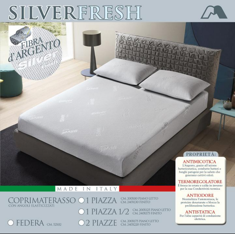 Da sempre conosciute, le proprietà dell'argento si riflettono nel COPRIMATERASSO SILVER FRESH di produzione italiana, con angoli elasticizzati.
