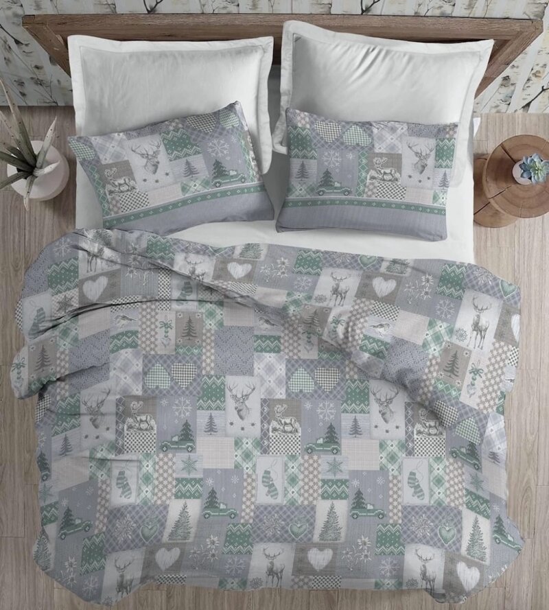 Il set copripiumino, comprende federe double stampate su entrambe i lati e Il sacco copripiumino che grazie alla comoda patella puo' essere comodamente rimboccato sotto il materasso per non lasciarti mai con i "piedi al vento". il tessuto 100% cotone ti avvolge donandoti un riposo celestiale.