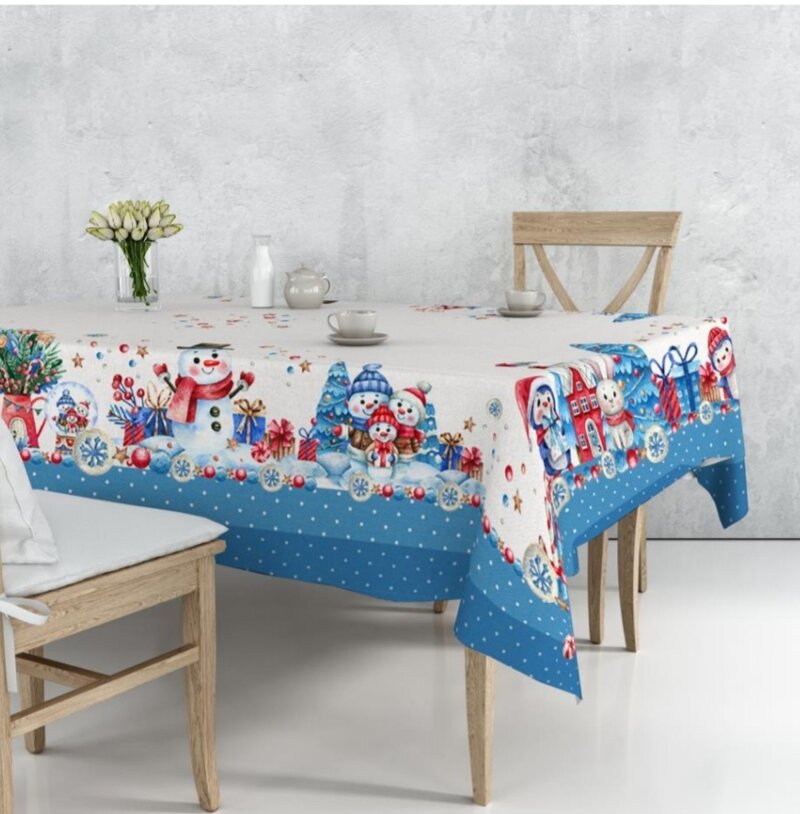 Tovaglia natalizia Pupazzo di neve, idrorepellente 100% cotone, in stampa digitale - blu / 6 posti 20254-440662-2086923